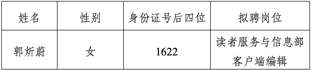 根據(jù)公開招聘相關(guān)規(guī)定,科技日?qǐng)?bào)社組織開展了讀者服務(wù)與信息部客戶端編輯公開招聘工作。經(jīng)資格審查、筆試、面試、考察、體檢等程序,研究確定了擬聘人員名單,現(xiàn)進(jìn)行公示。
