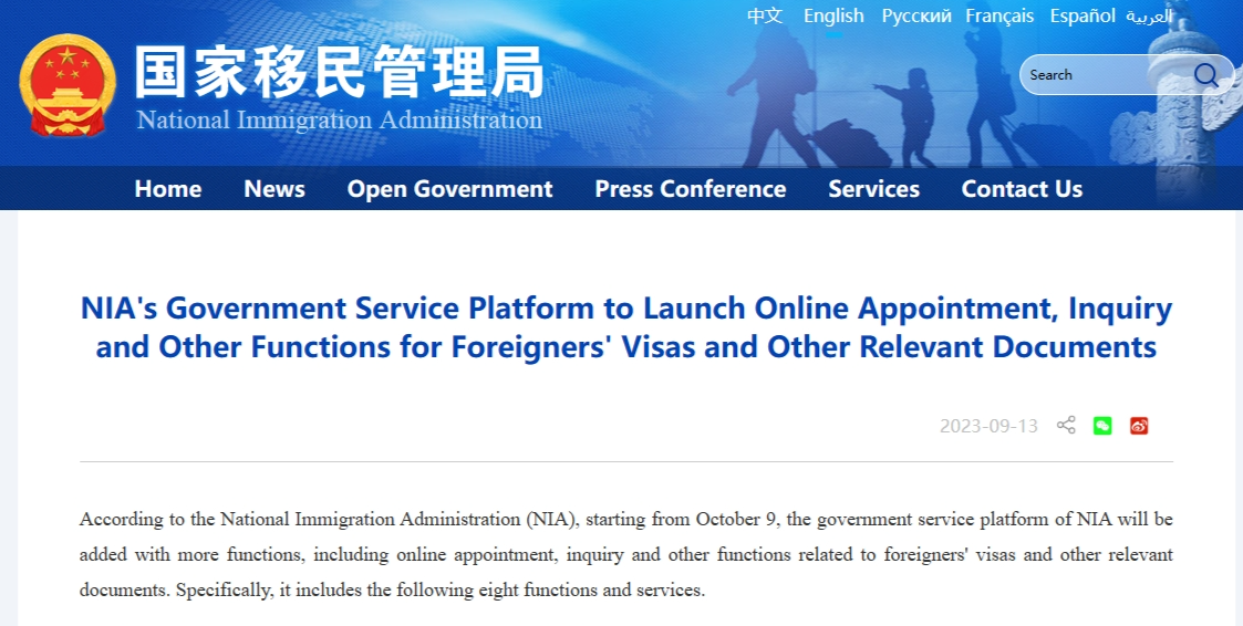 According to the National Immigration Administration (NIA), starting from October 9, the government service platform of NIA will be added with more functions, including online appointment, inquiry and other functions related to foreigners' visas and other relevant documents. Specifically, it includes the following eight functions and services.