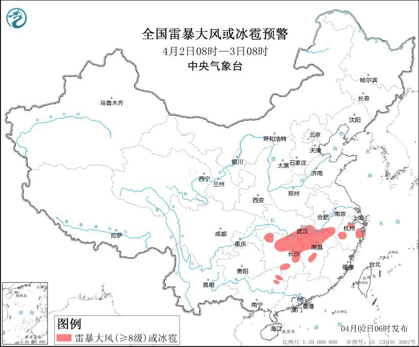 中央氣象臺4月2日06時繼續發布強對流天氣黃色預警:預計4月2日08時至3日08時,湖北南部、湖南中北部、江西中北部、浙江中東部、廣西東北部等地的部分地區將有8—10級雷暴大風或冰雹天氣,局地風力可達11級以上,冰雹直徑可達2厘米;安徽中南部、江蘇南部、上海北部、湖北東部和南部、湖南中北部、江西中北部、浙江西部和北部、福建西北部、重慶中東部、貴州東部、廣西東北部等地的部分地區將有短時強降水天氣,最大小時雨量30—50毫米,局地可達70毫米以上。