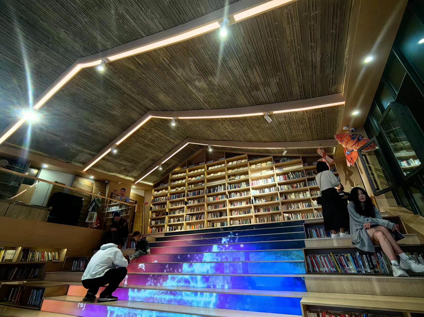 趙群偉提及,南宋書房總面積為約1250平方米,由普利茲克建筑獎獲得者王澍設計。建筑包含青磚黑瓦,玻璃幕墻,階梯狀的書架,LED屏幕的樓梯,糅合了宋代和現代元素。這樣的設計不僅讓書店成為街區亮眼的“網紅”,還體現了現代技術對傳統的承繼和發揚。