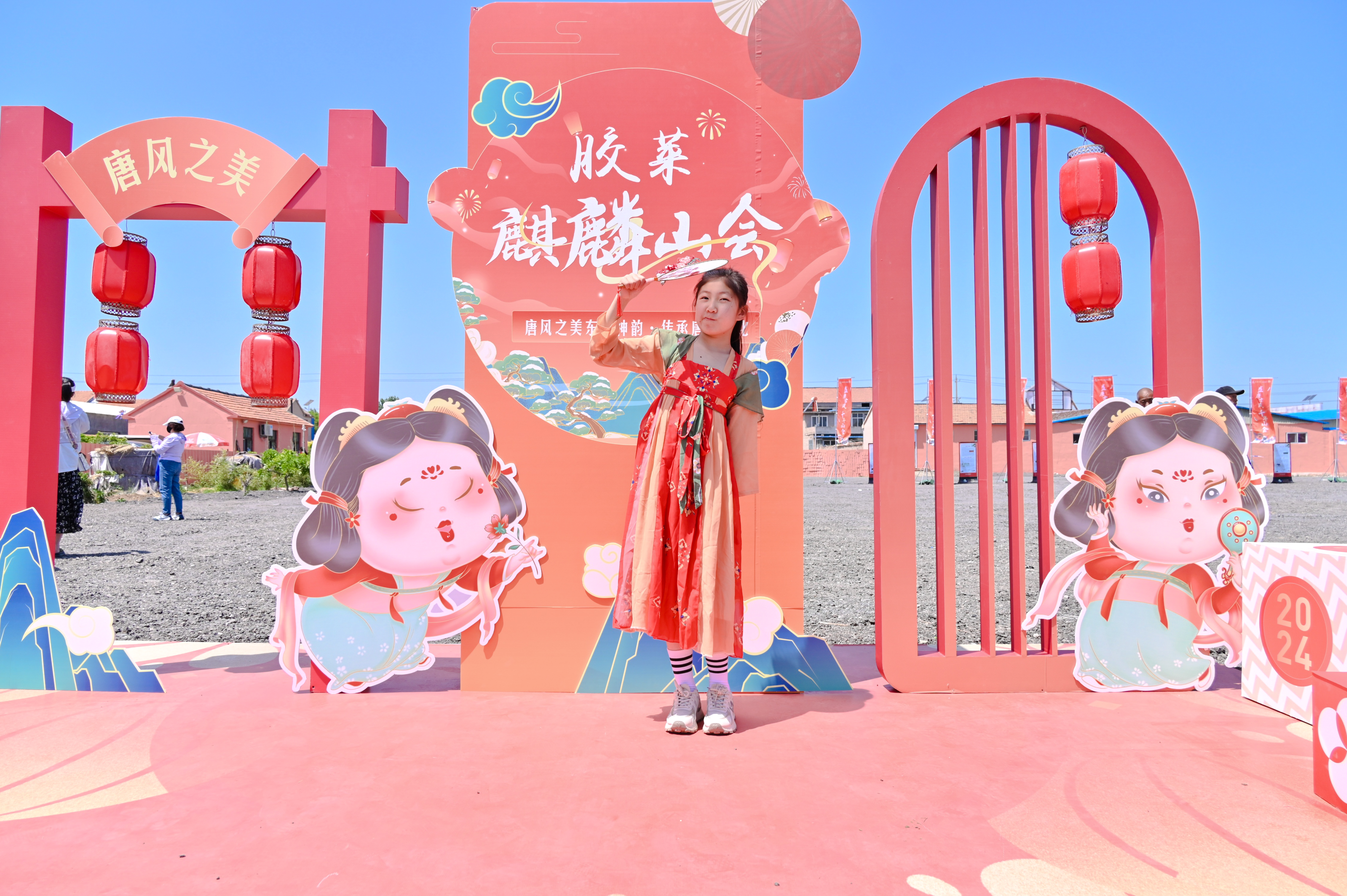 身著唐服的小朋友在麒麟山會上拍照留念。