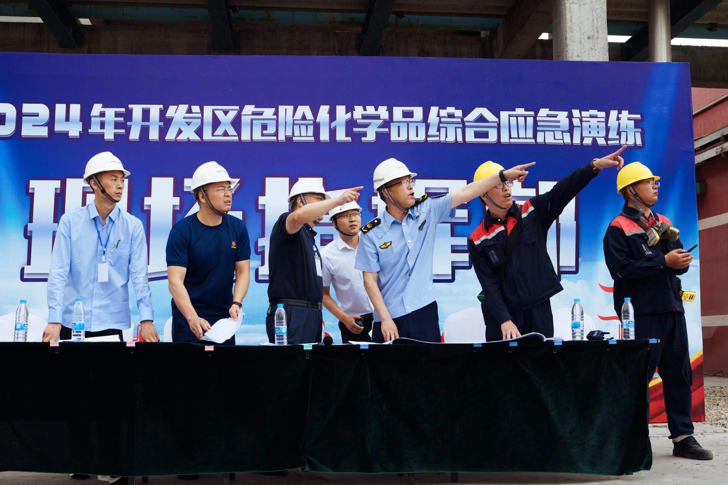 此次演練分為企業(yè)先期處置、啟動開發(fā)區(qū)生產(chǎn)安全事故應急響應、響應結(jié)束、專家點評和領導總結(jié)等階段。現(xiàn)場按照實景實戰(zhàn)、分級響應、部門聯(lián)動的方式開展了一場跨部門、全流程、全要素的協(xié)同式綜合模擬演練。共設置醫(yī)療救護、應急搶險、應急處置技術、物資保障等6個工作組,對現(xiàn)場進行警戒隔離、提供應急搶險物資、受傷人員(輕微中毒)進行營救、實施滅火、噴淋降溫、泄漏源控制等工作。