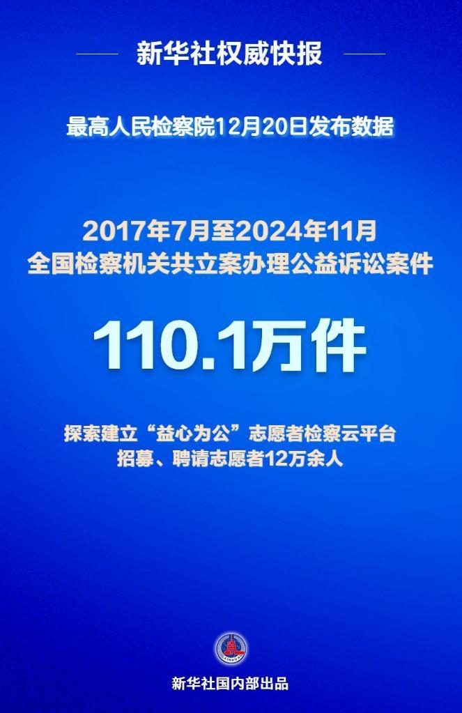 最高人民檢察院12月20日發布檢察公益訴訟有關情況顯示,2017年7月至2024年11月,全國檢察機關共立案辦理公益訴訟案件110.1萬件,其中行政公益訴訟案件98.9萬件,民事公益訴訟案件11.2萬件。