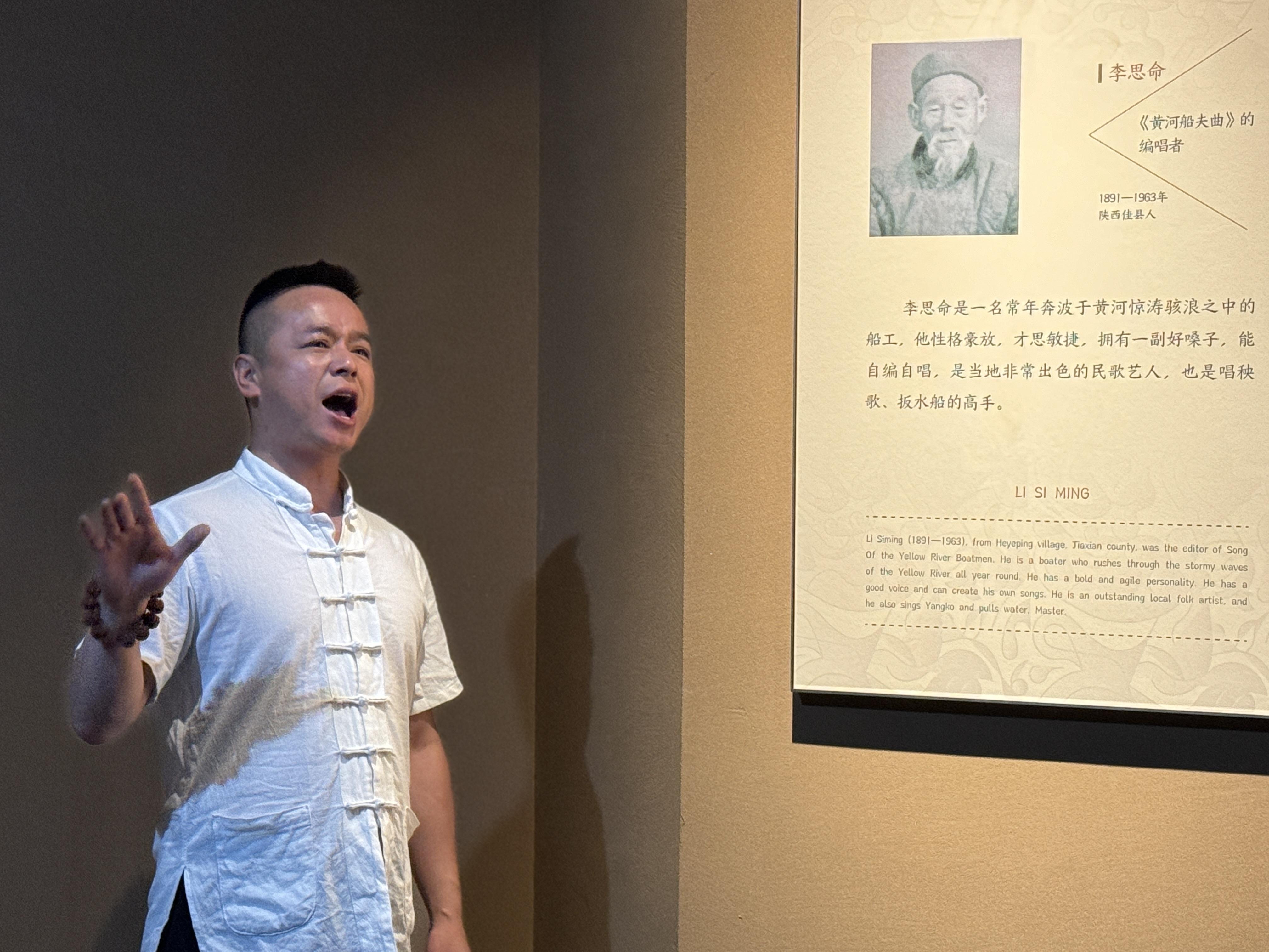 “你曉得天下黃河幾十幾道彎……”陜北民歌博物館演唱老師王志行一開嗓,游客立刻被“釘”在原地。他沒有拿擴音器,也沒有介紹展品,而是站在一幅黃河奔騰的全息投影前,用一曲《黃河船夫曲》把所有人“拽”進了黃河岸邊的纖夫勞作現場。