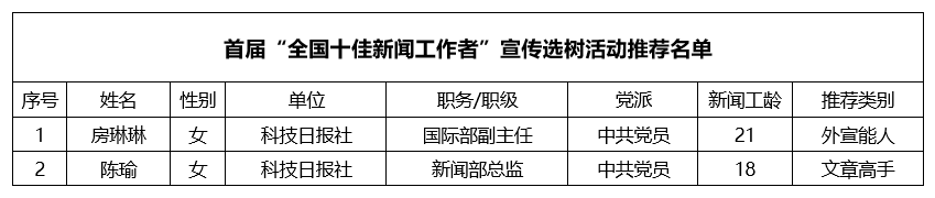 根據中國記協《關于開展首屆“全國十佳新聞工作者”宣傳選樹活動的通知》要求,經研究,本社確定房琳琳、陳瑜為推薦人選,現予公示,公示時間為2025年9月17日至22日。如有異議,請反饋至科技日報社科學教育部。