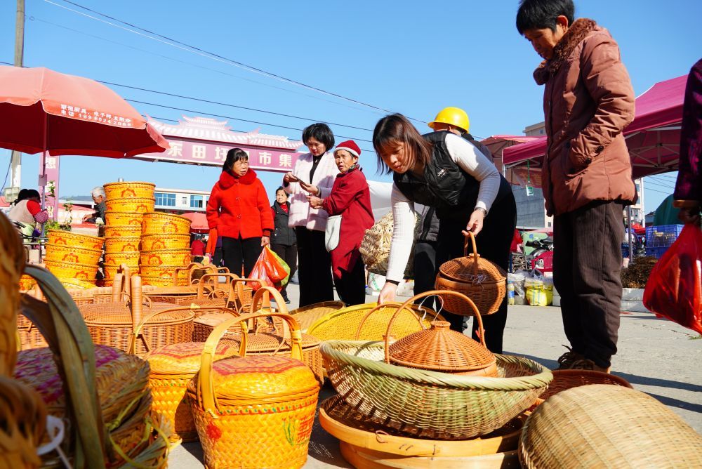 “土特產”相關攤位最受歡迎。阿公阿婆自家采收的時令土特產和山貨,傳統手工藝人現場制作的竹編工藝品,鹽雞、炸棗、五香卷等地道美食的攤位前,都排起了隊伍。特色攤位一字排開,不少顧客感慨“錢沒怎么花,東西就拎不動了”。