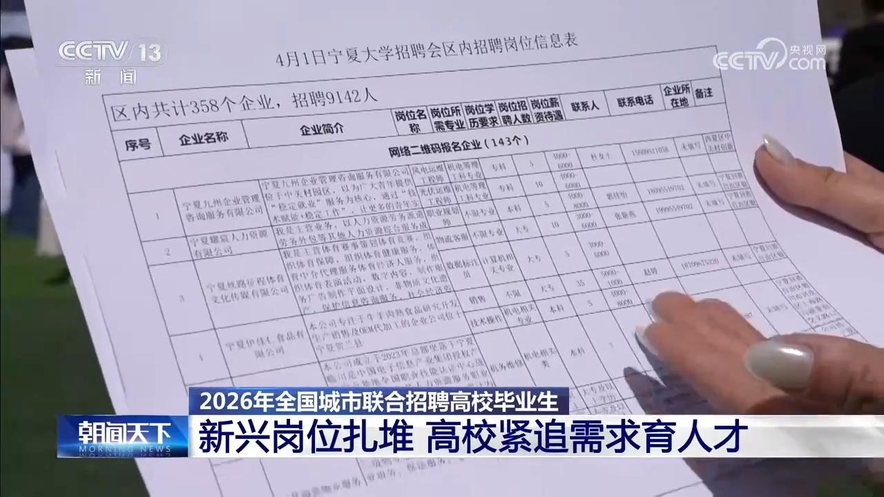 總臺央視記者 唐蕾:我現在在寧夏銀川的2026年全國春招啟動儀式的現場,今天(4月1日)一共有1.1萬多個崗位,從我手中的招聘崗位信息表可以看出,能源化工和新材料的崗位占了42%,人工智能、數字經濟相關的前沿科技領域也備受求職者青睞。
