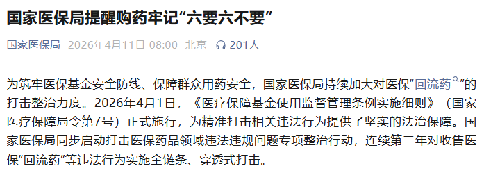 為筑牢醫保基金安全防線、保障群眾用藥安全,國家醫保局持續加大對醫保“回流藥”的打擊整治力度。2026年4月1日,《醫療保障基金使用監督管理條例實施細則》(國家醫療保障局令第7號)正式施行,為精準打擊相關違法行為提供了堅實的法治保障。國家醫保局同步啟動打擊醫保藥品領域違法違規問題專項整治行動,連續第二年對收售醫保“回流藥”等違法行為實施全鏈條、穿透式打擊。