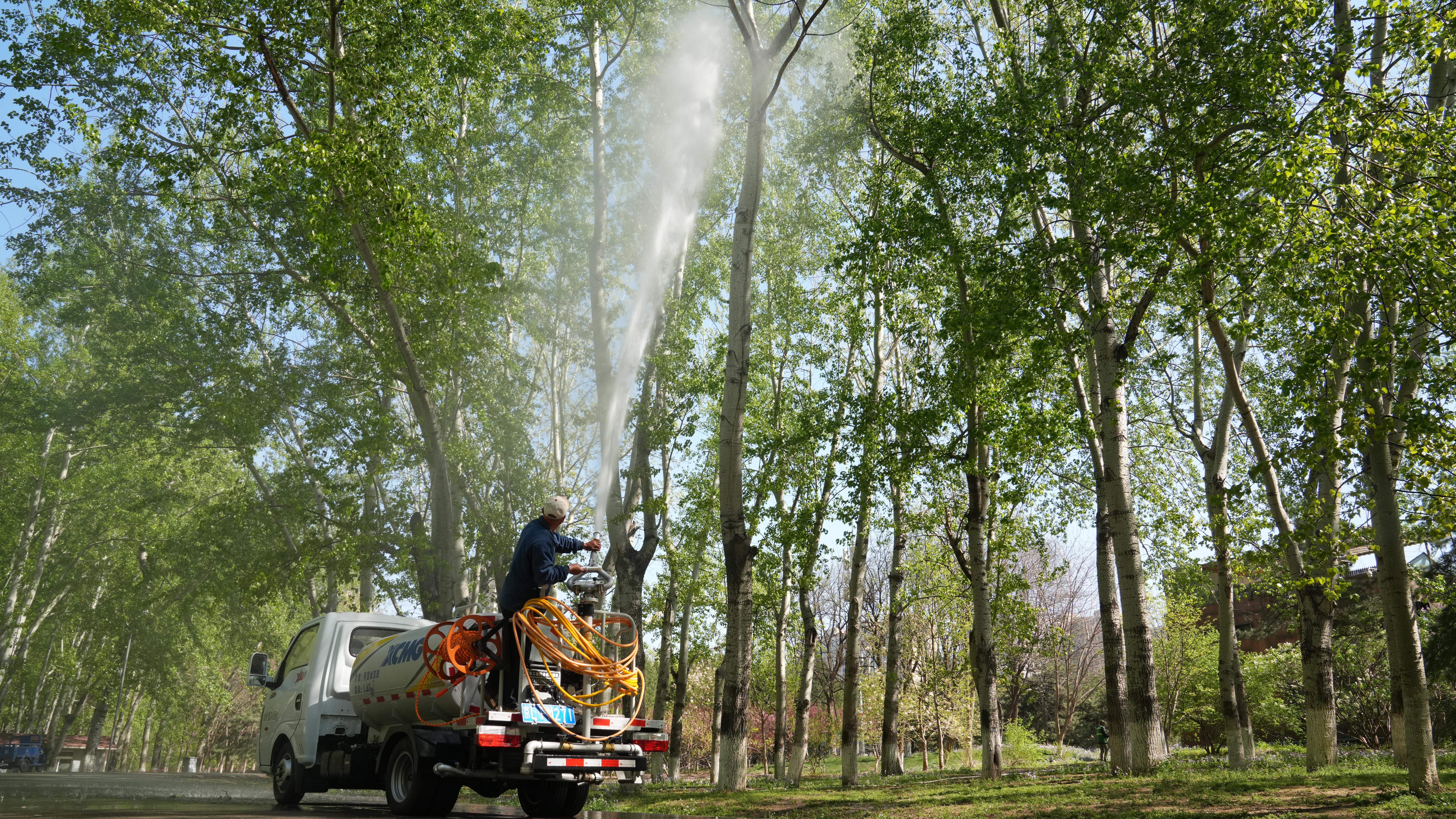 針對已進入成熟期、暫無法立即替換的存量楊柳雌株,北京以技術創新為抓手,推動多款智能化防控技術與專用裝備落地應用,實現飛絮高效精準治理。其中,由北京市園林綠化科學研究院系統改良的楊柳飛絮凝絮劑為無毒無害的環境友好型高分子有機物,可適配高壓霧炮車、無人機等多種噴施設備。