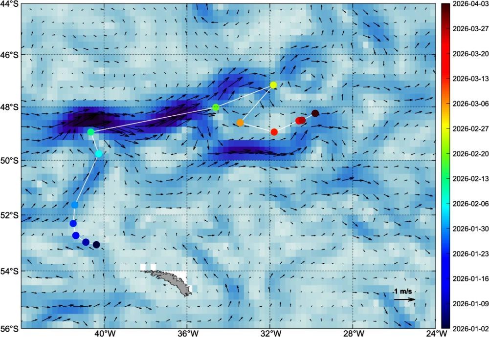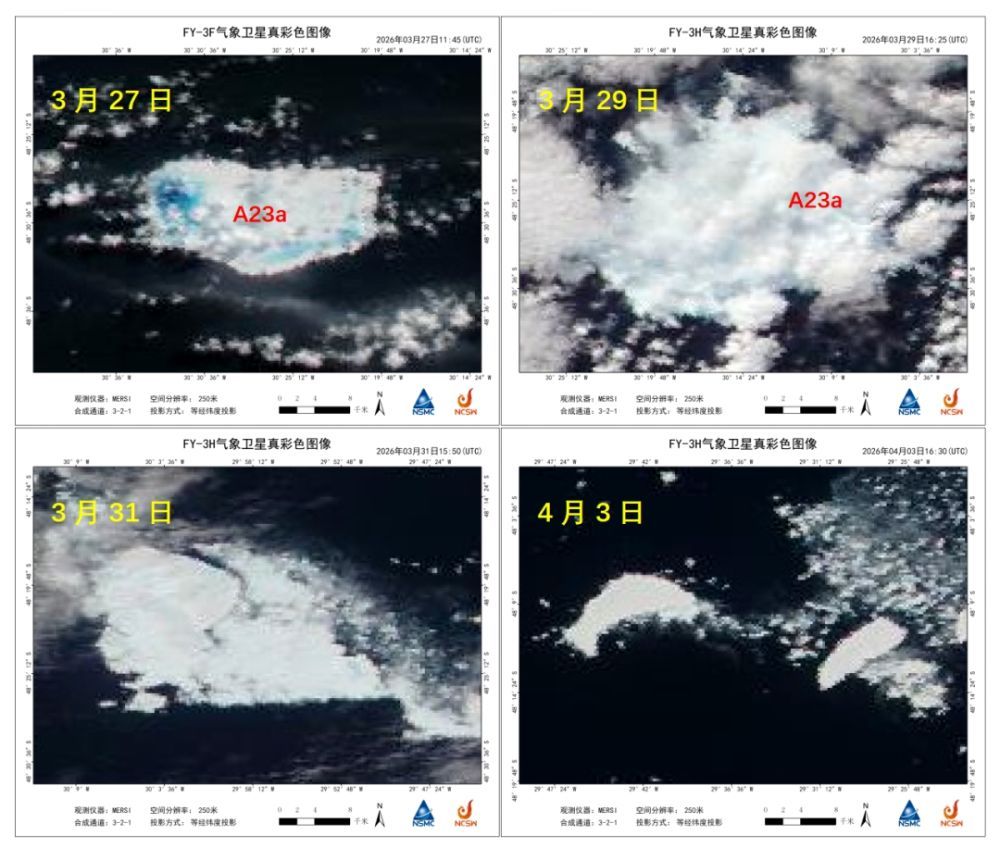 國家衛(wèi)星氣象中心(國家空間天氣監(jiān)測預(yù)警中心)國際用戶服務(wù)中心首席專家鄭照軍介紹,從2022年末開始,風(fēng)云氣象衛(wèi)星監(jiān)測到A23a的7個明顯變化時(shí)段:威德爾海加速漂移階段(2022年末至2024年初),卷入海洋渦旋滯留(2024年3月至12月),南喬治亞島西南大陸架擱淺(2025年3月至5月),重新漂移并大規(guī)模崩解(2025年6月至8月),災(zāi)難性大幅解體(2025年9月),瘦身后向低緯度漂移并顯著融化(2025年10月至2026年1月),連續(xù)三次末期崩解至編號注銷(2026年2月至4月)。