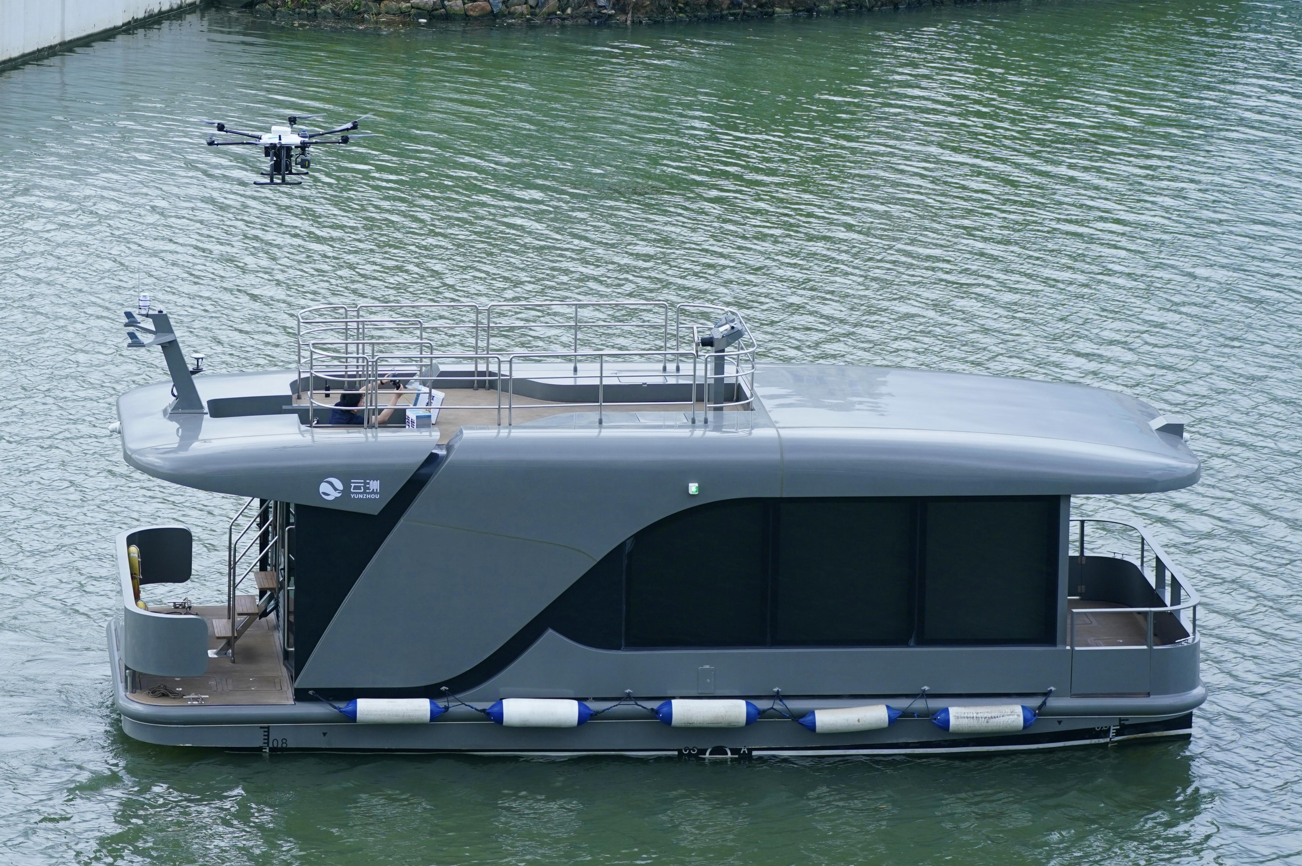 螺旋槳發出低沉的嗡鳴,一架無人機貼著河面緩緩逼近順流而來的智能無人游船,機身懸停、索降啟動,生活物資被精準投送至船板上;河對岸,另一架無人直升機穿過樓宇間隙,不作停頓,直接空投,應急物資劃出一道弧線,穩穩落向指定區域……