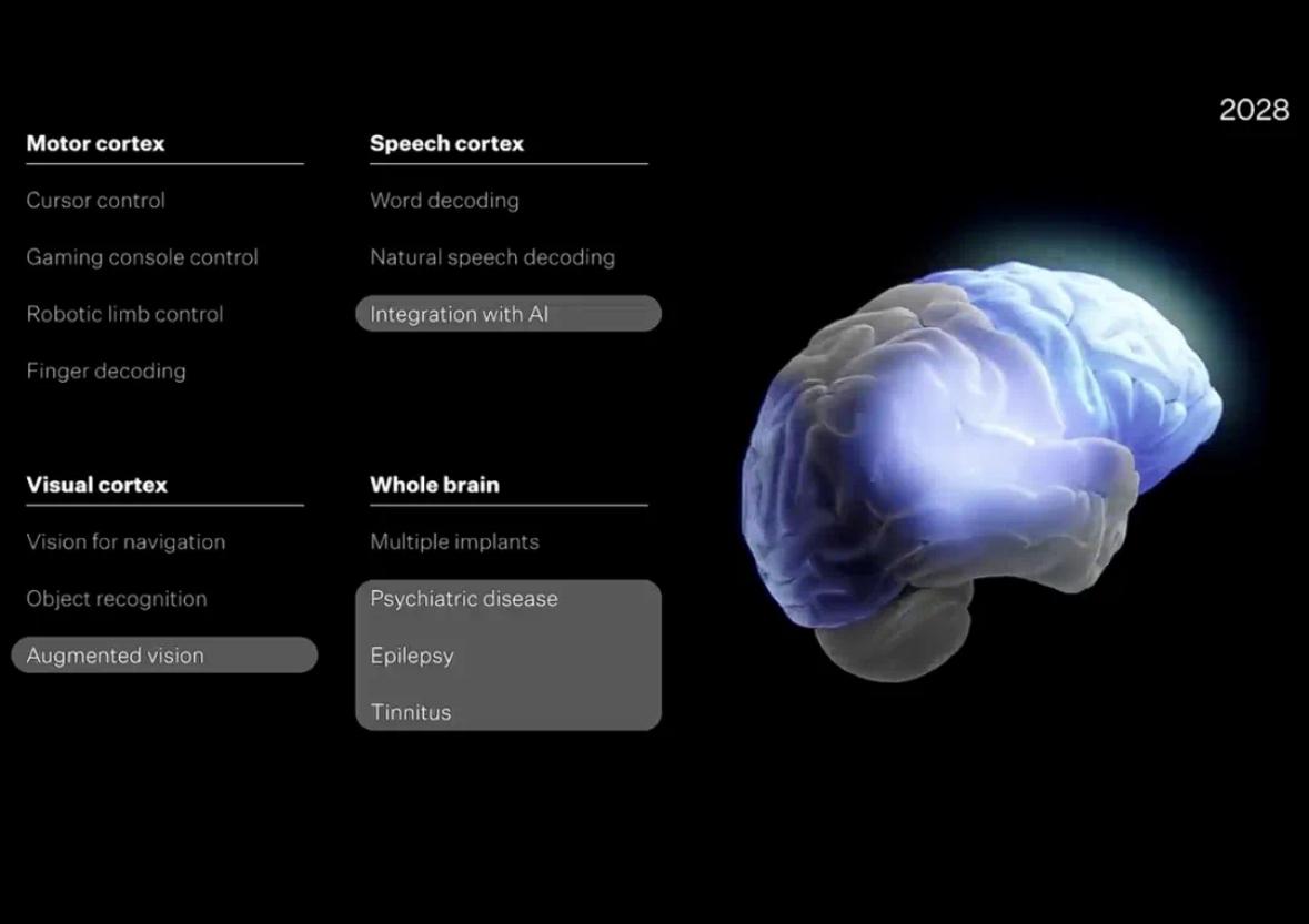 根據(jù)Neuralink發(fā)布的“三年路線圖”,他們將在2025年第四季度實(shí)現(xiàn)言語(yǔ)皮層設(shè)備植入,直接從大腦信號(hào)中解碼詞語(yǔ)并轉(zhuǎn)換為語(yǔ)音;2026年則將電極數(shù)量提升至3000個(gè),使首位盲視參與者恢復(fù)視覺(jué),嘗試達(dá)到超人級(jí)別的多波段視覺(jué);2027年,通道數(shù)將進(jìn)一步增至10000個(gè),首次實(shí)現(xiàn)多設(shè)備植入,覆蓋運(yùn)動(dòng)、言語(yǔ)和視覺(jué)皮層;到2028年,每個(gè)植入接口將擁有超過(guò)25000個(gè)通道,能夠訪問(wèn)大腦的任何部分,可治療精神疾病、疼痛和其他失調(diào)狀態(tài),甚至更驚人的——讓人類(lèi)與AI集成。