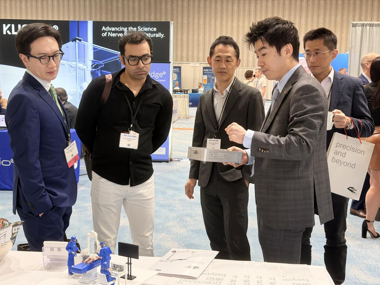 此次展示的技術平臺Kai,來自專注高精度手術機器人研發的中國企業“昂泰微精”。Kai的機械末端能夠以極高的穩定性,控制、操作直徑約30微米的極細顯微縫合器械。這一精度不僅超越人類手部穩定性極限,更達到了當前工程學與醫學結合的前沿水平。