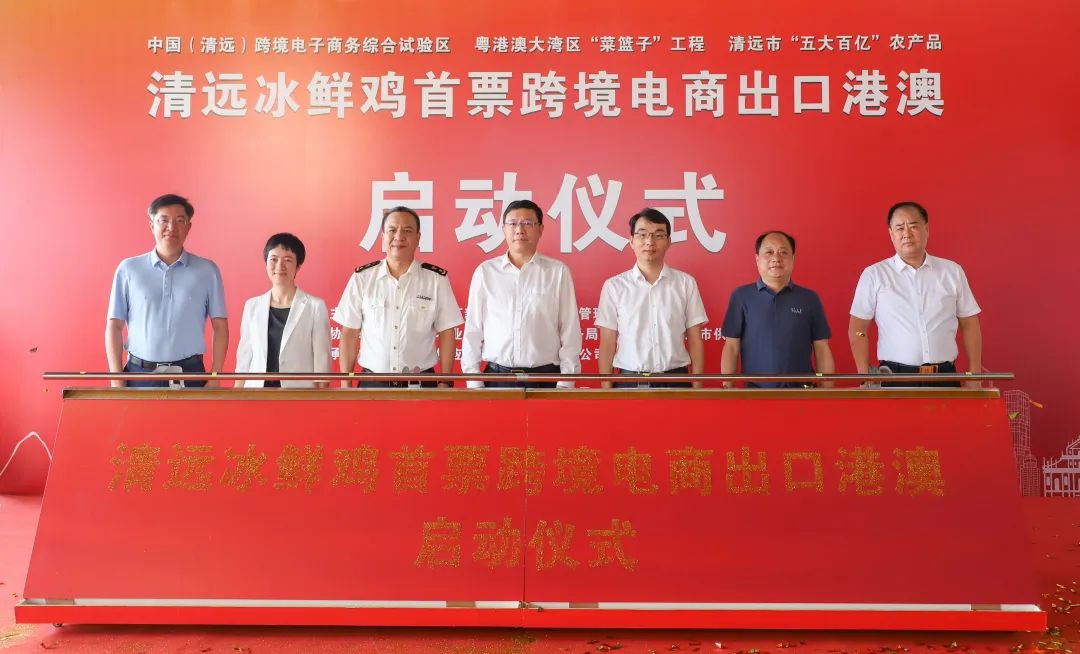 8月18日上午,清遠冰鮮雞首票跨境電商出口港澳啟動儀式在廣東省清遠市跨境電子商務清關中心舉行。現場兩臺載著3000只經檢驗檢疫合格的清遠冰鮮雞的車輛從清遠市跨境電子商務清關中心同時發往香港和澳門,這些雞最快4個小時就可以擺上港澳市民的餐桌。