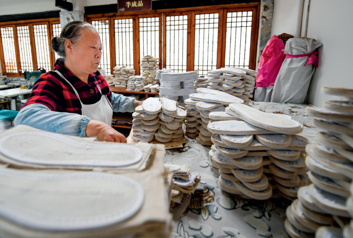 △ 2020年4月17日,成都市郫都區唐昌街道戰旗村,賴淑芳整理擺放制作完成的布鞋鞋底。