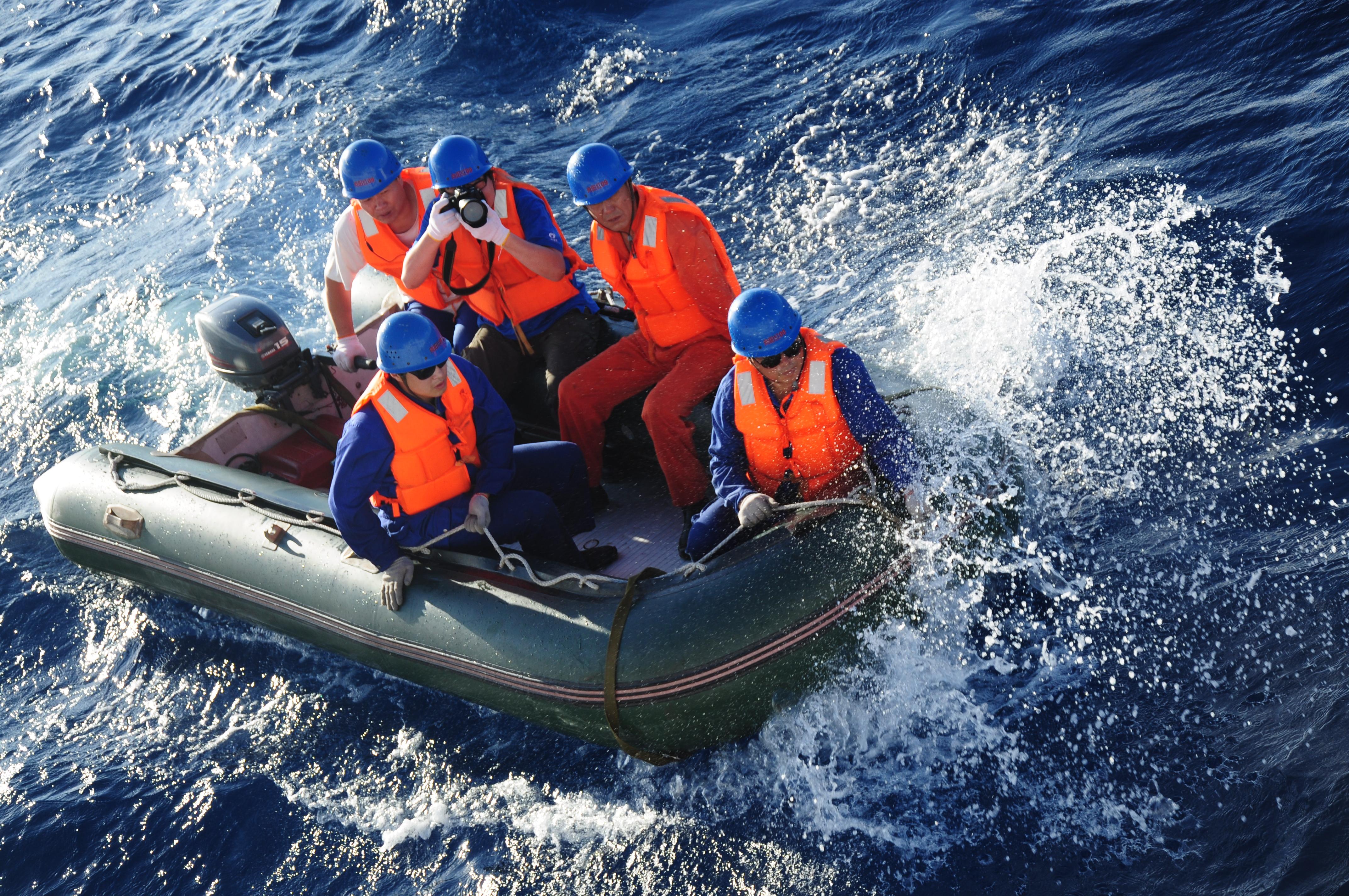 登艇時我遇到了麻煩。雖然天晴了,風浪卻不小。我順著掛在母船外的豎梯往下爬,上一秒明明已經踩到小艇,下一秒又與小艇相隔一人多高。最后我心一橫眼一閉,找準節奏松開手,四腳朝天跌入艇中。見我笨手笨腳的樣子,“蛙人”小組深感憂慮。小艇駕駛員張正云和組員張會生把我夾住,一左一右緊拽我的胳膊,我剛想說不用,一個浪劈頭打來,話音伴著海水一起咽了回去,整個人從眼鏡濕到襪子。