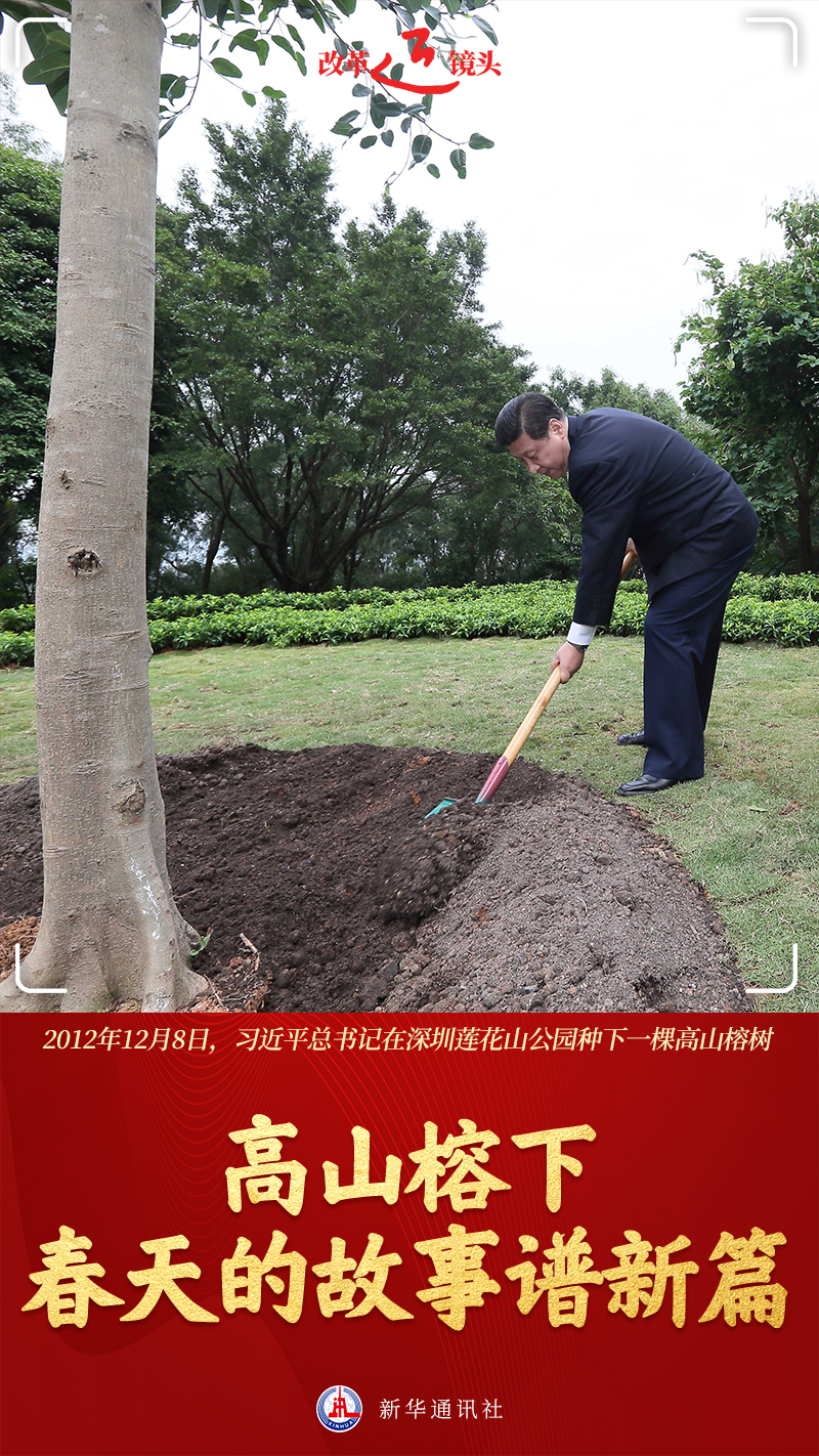 高山榕是嶺南本土樹種,四季常綠、蒼勁挺拔。1992年,鄧小平同志在深圳仙湖植物園也曾親手種下一棵高山榕。“高山榕的特質與堅韌頑強、奮發向上的改革精神相契合。”時任深圳市蓮花山公園管理處主任楊義標說。