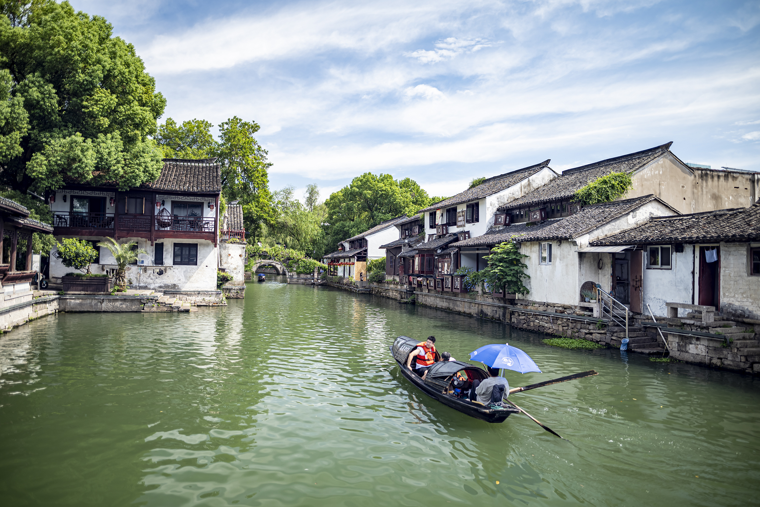 Tourists go sightseeing on a boat along the Cangqiao Straight Street in Shaoxing, east China's Zhejiang province, which is a historical and cultural street with unique ancient houses. (PHOTO: VCG)