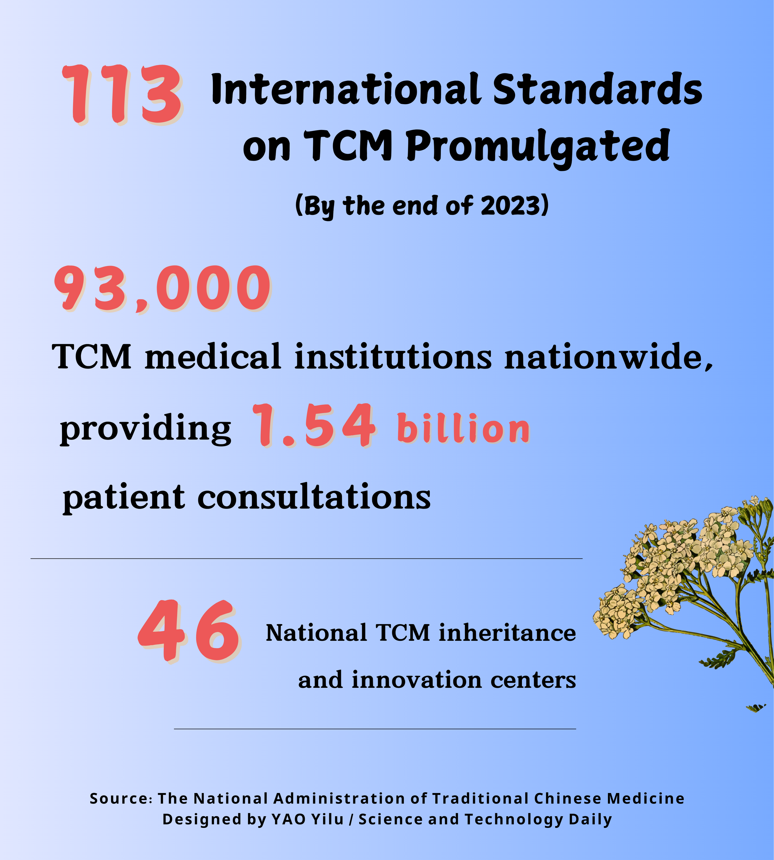 The International Organization for Standardization/Technical Committee for Traditional Chinese Medicine (ISO/TC 249) has formulated 113 international standards on TCM. To illustrate, in 2023, there were 93,000 TCM medical institutions nationwide, providing 1.54 billion patient consultations.