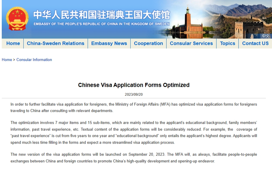 Noting that the new version of the visa application forms was launched on September 20, 2023, Mao said the Foreign Ministry will, as always, facilitate people-to-people exchanges between China and foreign countries to promote China's high-quality development and opening-up endeavor