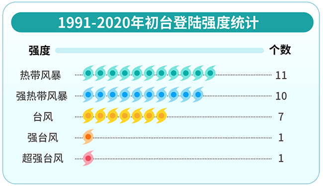 1991-2020年初臺(tái)登陸強(qiáng)度統(tǒng)計(jì)。丁茜制圖?新華社發(fā)