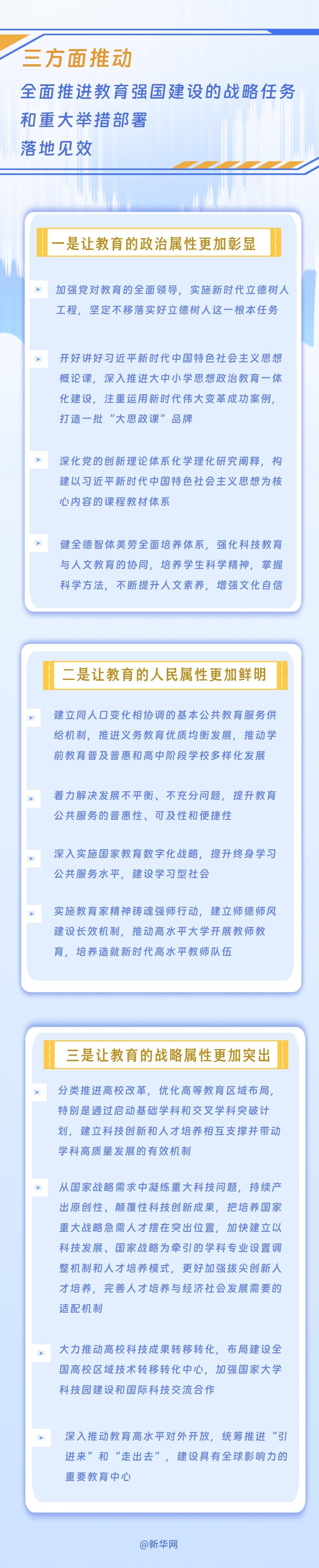 懷進鵬介紹,將重點從讓教育的政治屬性更加彰顯、讓教育的人民屬性更加鮮明、讓教育的戰略屬性更加突出三個方面推進。
