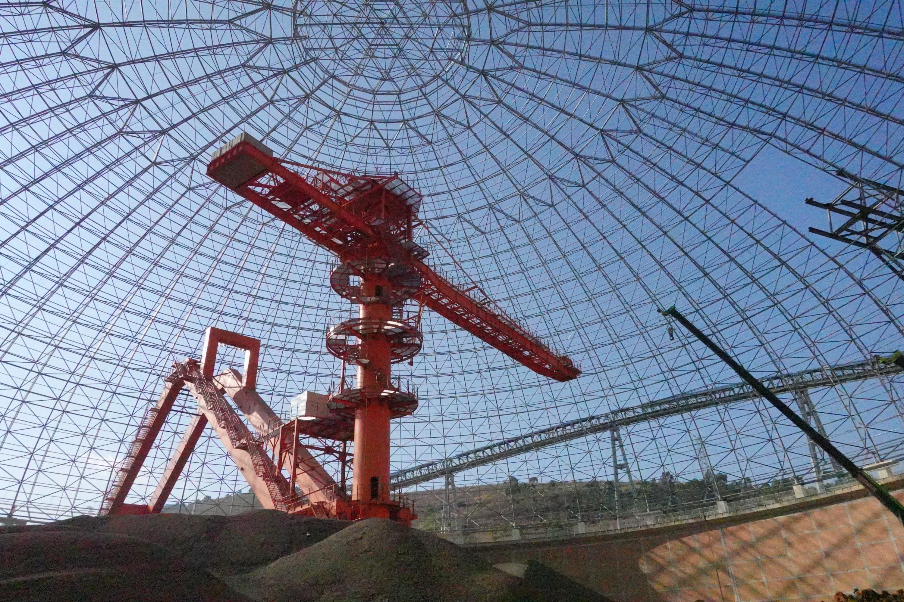 穿過輸煤管道棧橋,走進直徑達120米的圓形煤場,巨大的穹頂,“網”住夕陽斜輝,人顯得格外渺小。