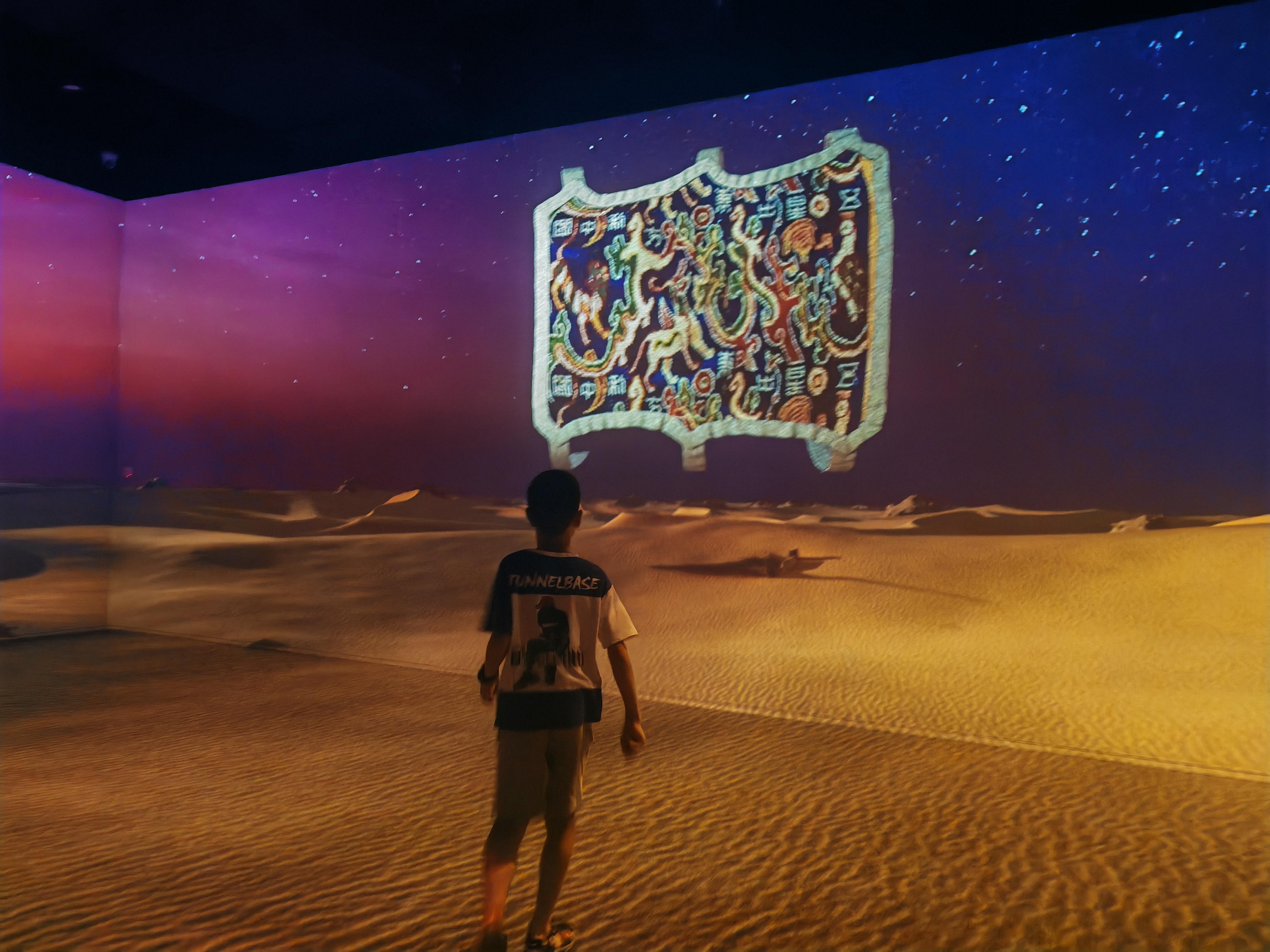 感嘆完織錦工藝的巧奪天工,黃巧妹和家人被變幻的光影吸引,走進(jìn)全域交互劇場(chǎng)?!斑@個(gè)劇場(chǎng)‘渾身’都是高科技?!睏钏冀榻B,劇場(chǎng)通過(guò)空間數(shù)字聲場(chǎng)、體感交互等技術(shù),將尼雅遺址的實(shí)景影像和模擬圖景有機(jī)融合,利用激光交互技術(shù)、全景聲技術(shù)和裸眼3D等,激發(fā)了觀眾的共鳴。