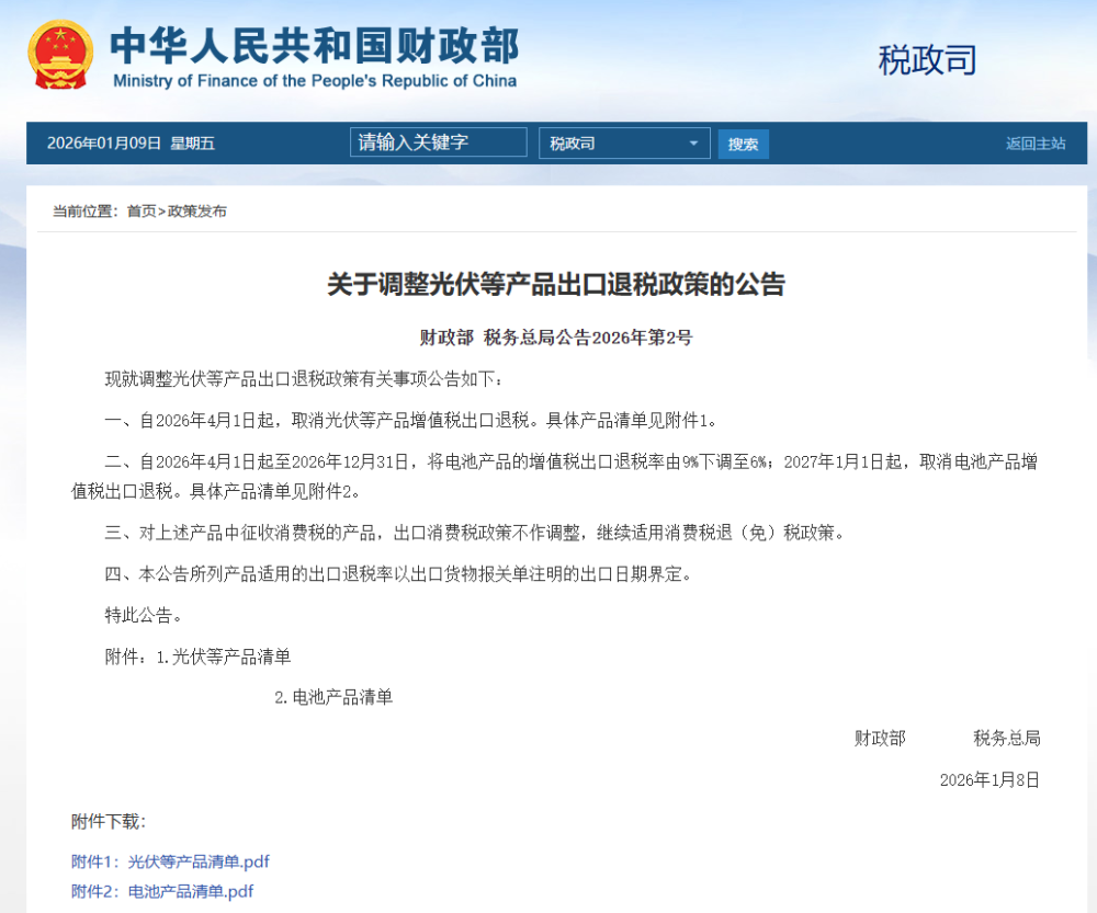 一、自2026年4月1日起,取消光伏等產品增值稅出口退稅。具體產品清單見附件1。