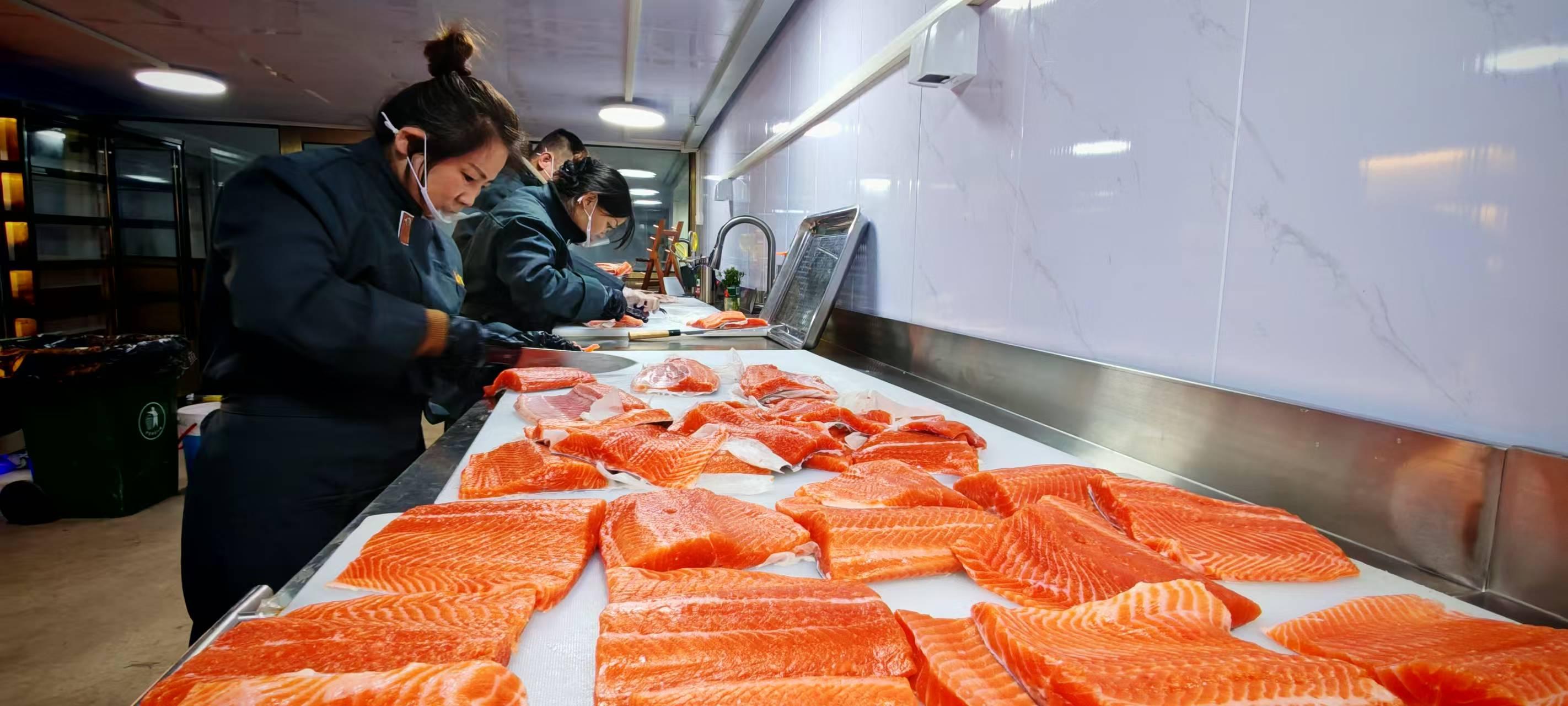 春節臨近,山西省太原市的海鮮市場日益紅火。該市晉源區傳鮮予鮮農場的大西洋鮭魚(俗稱三文魚)正蓄勢待發,即將上市。