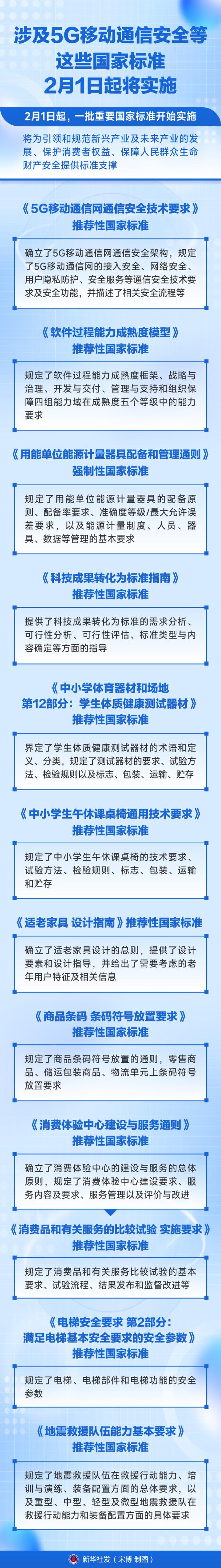 2月1日起,涉及5G移動通信安全、中小學生午休課桌椅、消費者服務、電梯安全、地震救援隊伍能力等一批重要國家標準開始實施,將為引領和規范新興產業及未來產業的發展、保護消費者權益、保障人民群眾生命財產安全提供標準支撐。
