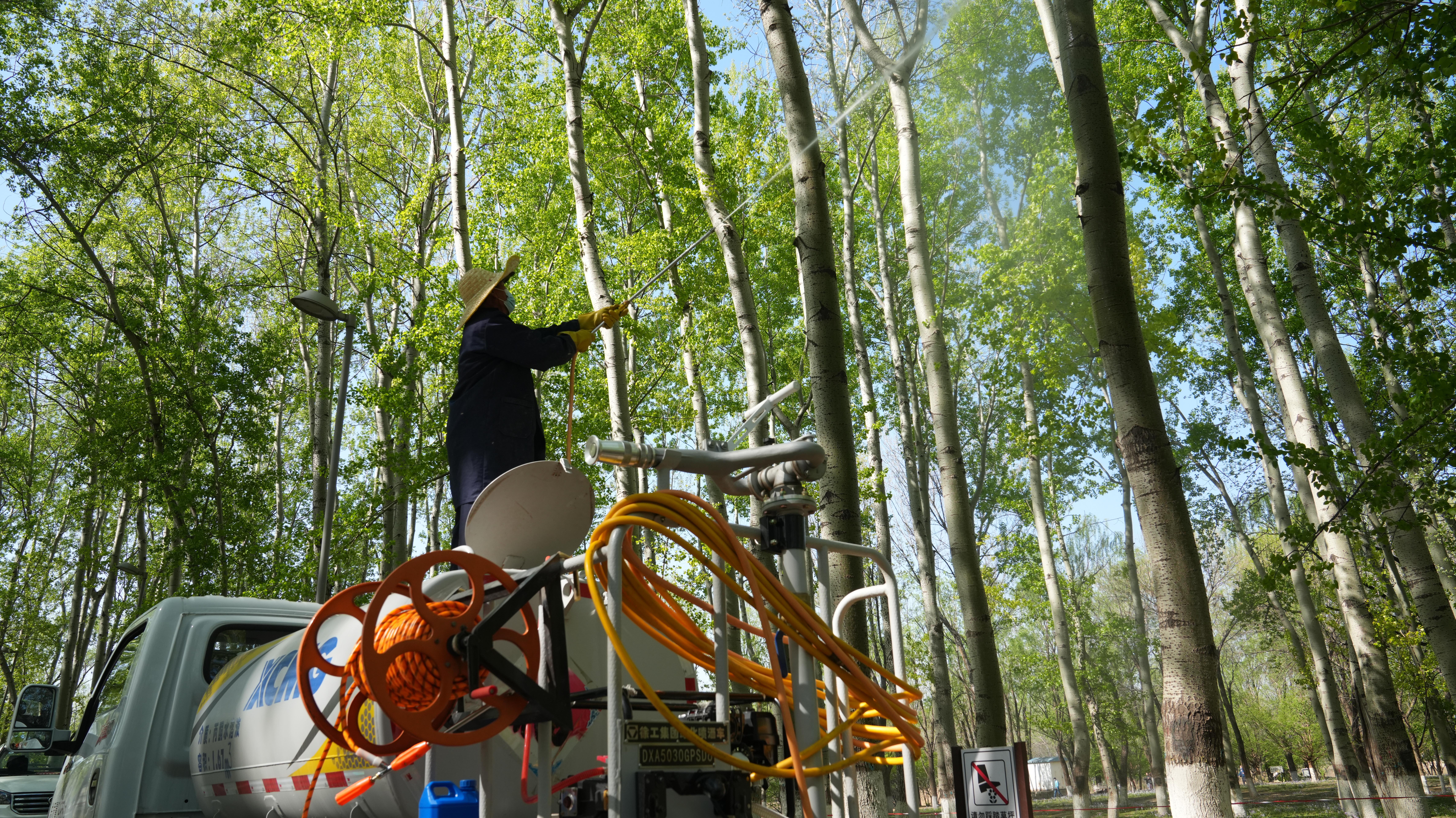 針對已進入成熟期、暫無法立即替換的存量楊柳雌株,北京以技術創新為抓手,推動多款智能化防控技術與專用裝備落地應用,實現飛絮高效精準治理。其中,由北京市園林綠化科學研究院系統改良的楊柳飛絮凝絮劑為無毒無害的環境友好型高分子有機物,可適配高壓霧炮車、無人機等多種噴施設備。