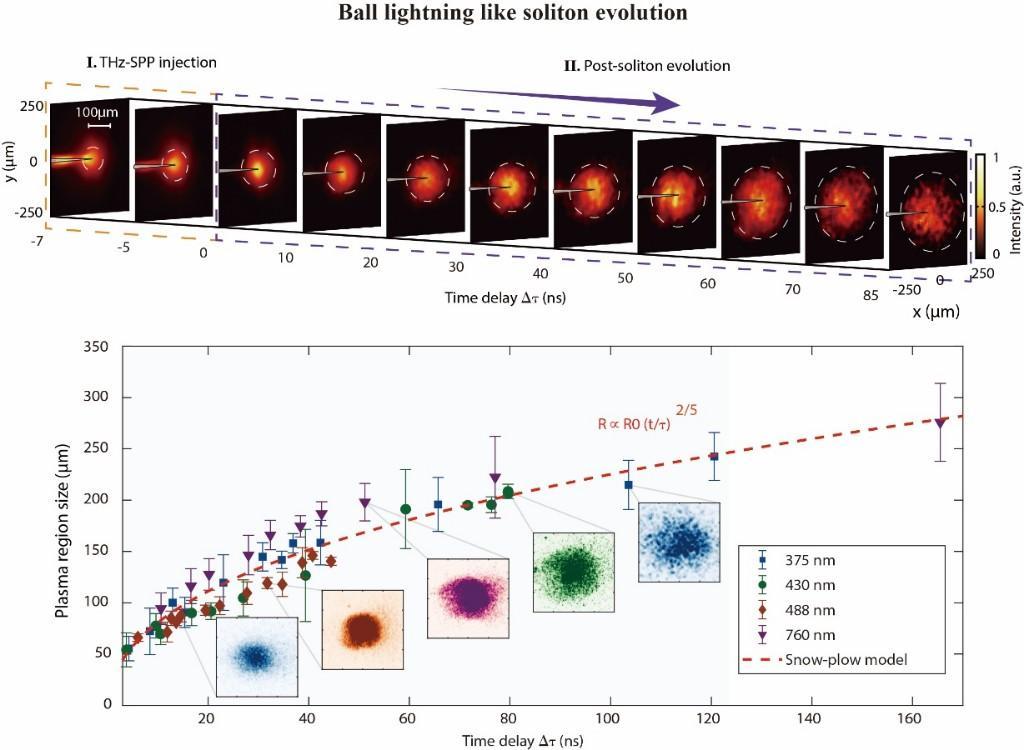 研究團隊在強激光驅動太赫茲源領域長期深耕,自主搭建時空分辨診斷系統(tǒng),實現(xiàn)孤子全過程精準觀測。實驗室中,高速攝像機捕捉到:明亮白球被幽藍等離子體外殼包裹,如“光之繭”般緩慢膨脹、最終耗散。該電磁孤子直徑約百微米、壽命達百納秒,光譜覆蓋紫外至紅外寬波段,經(jīng)物理標度變換,可對應自然界直徑幾十厘米、持續(xù)數(shù)秒的球狀閃電。